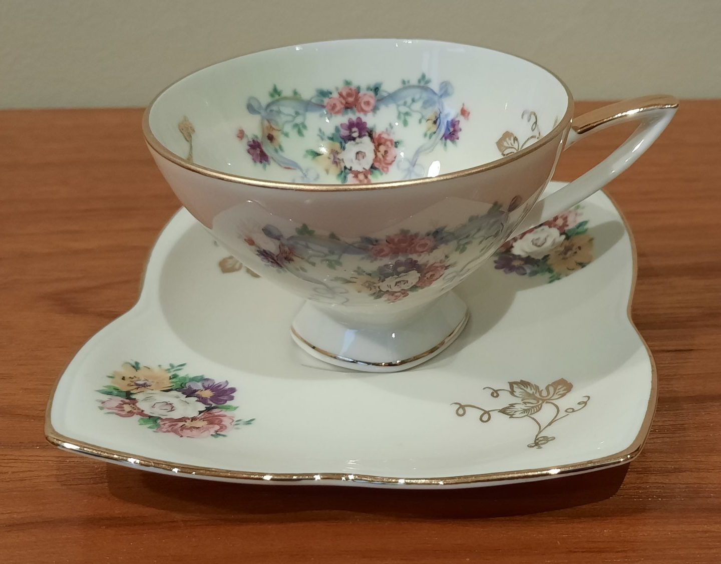 klein kopje zonder merk, met kleurrijke bloemen met een gouden randje
