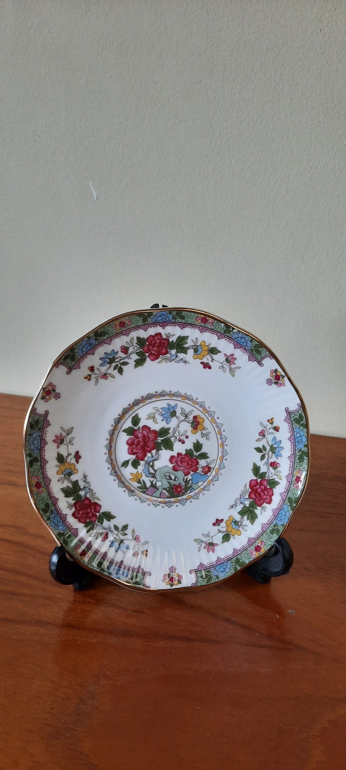 mooie kop en schotel met rode, blauwe en gele bloemen.