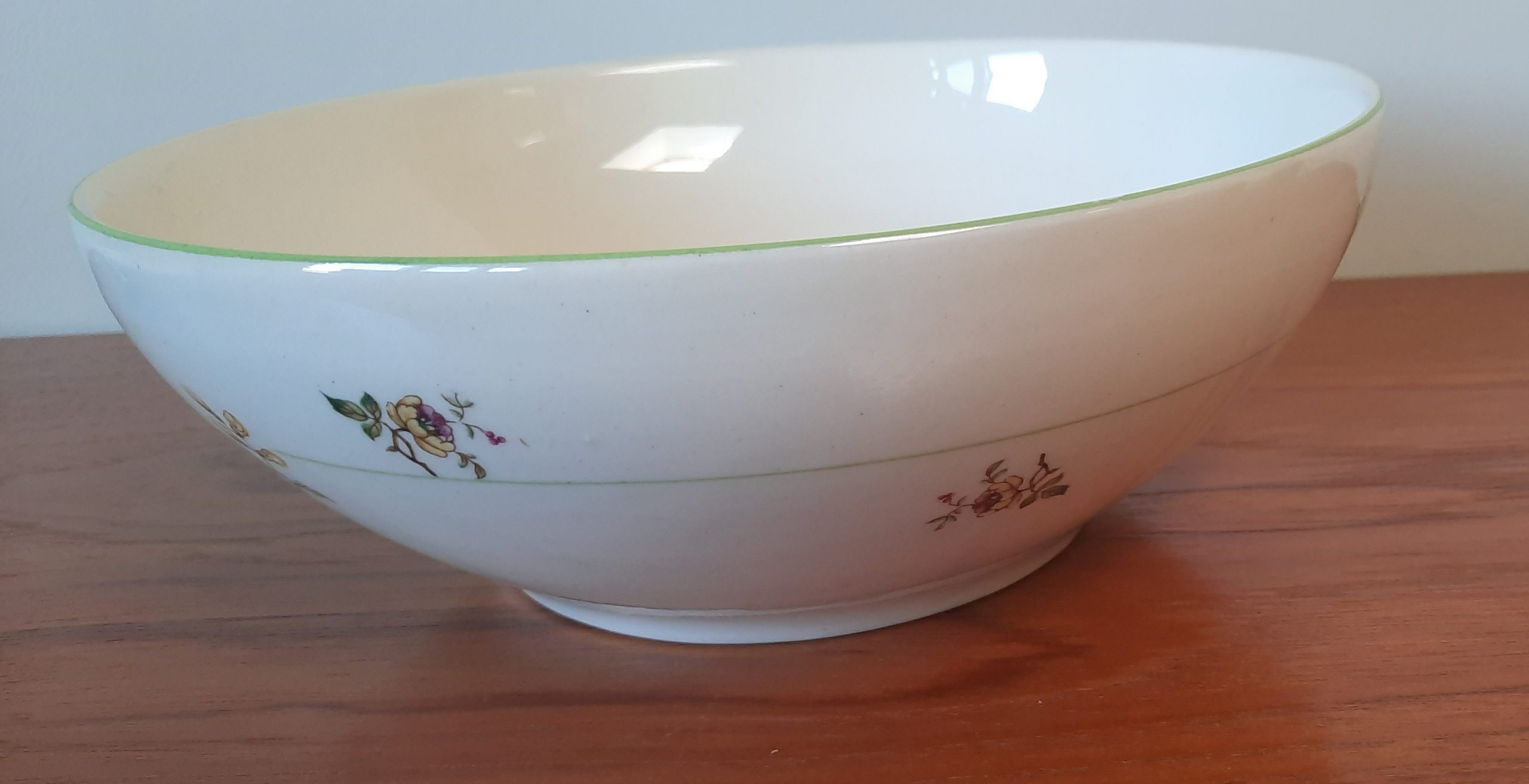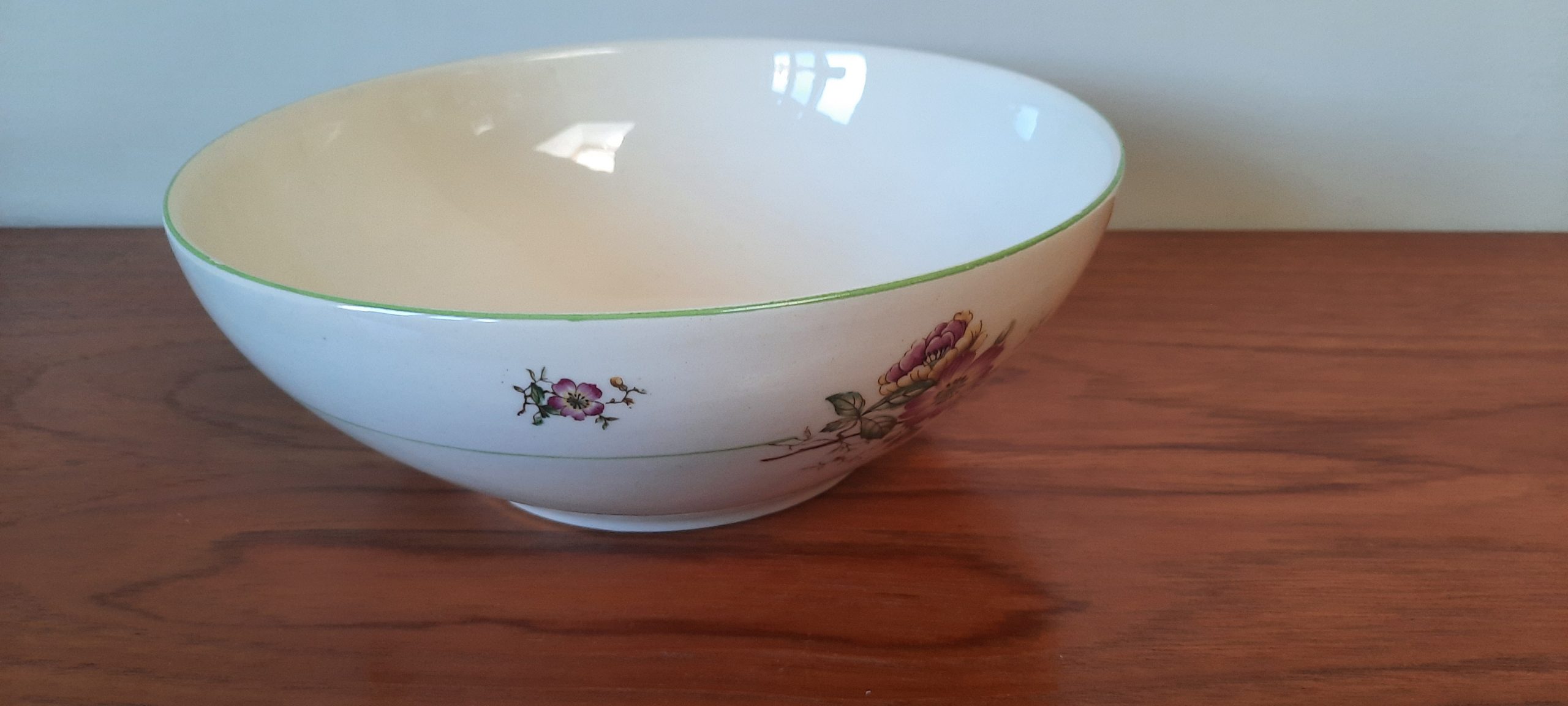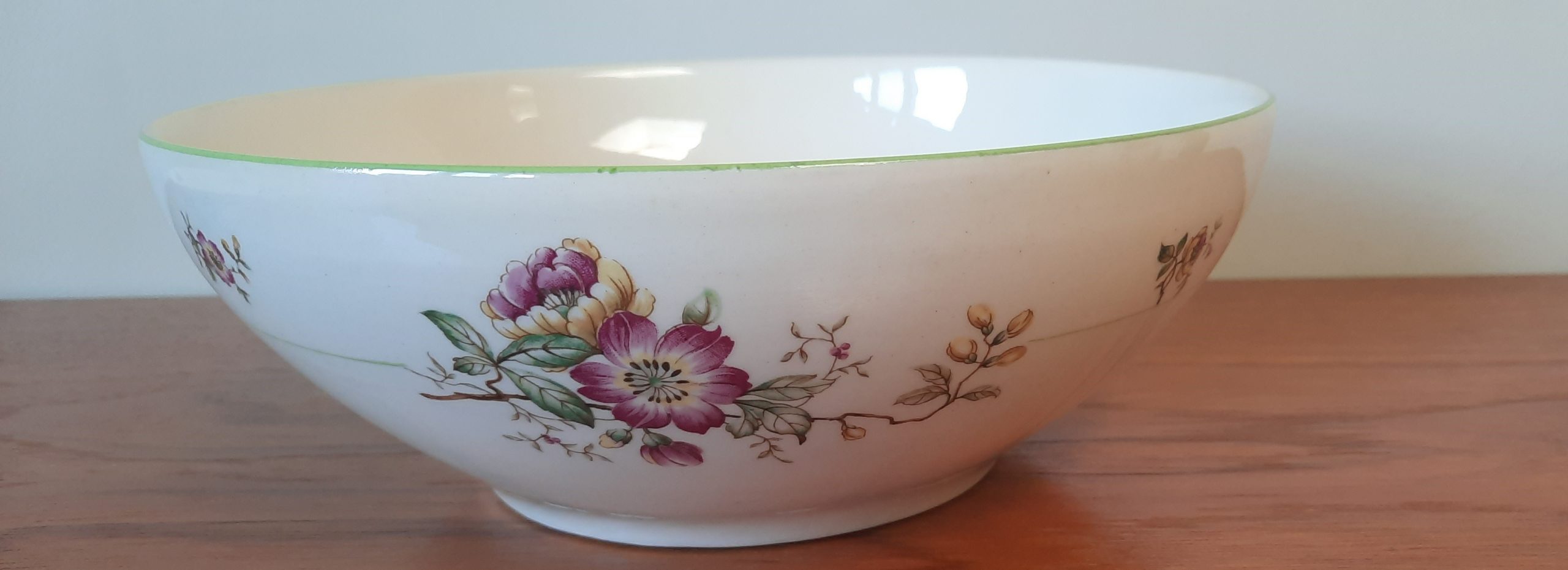 schaal Roomwit met groene bies en decor van wilde roze rozen