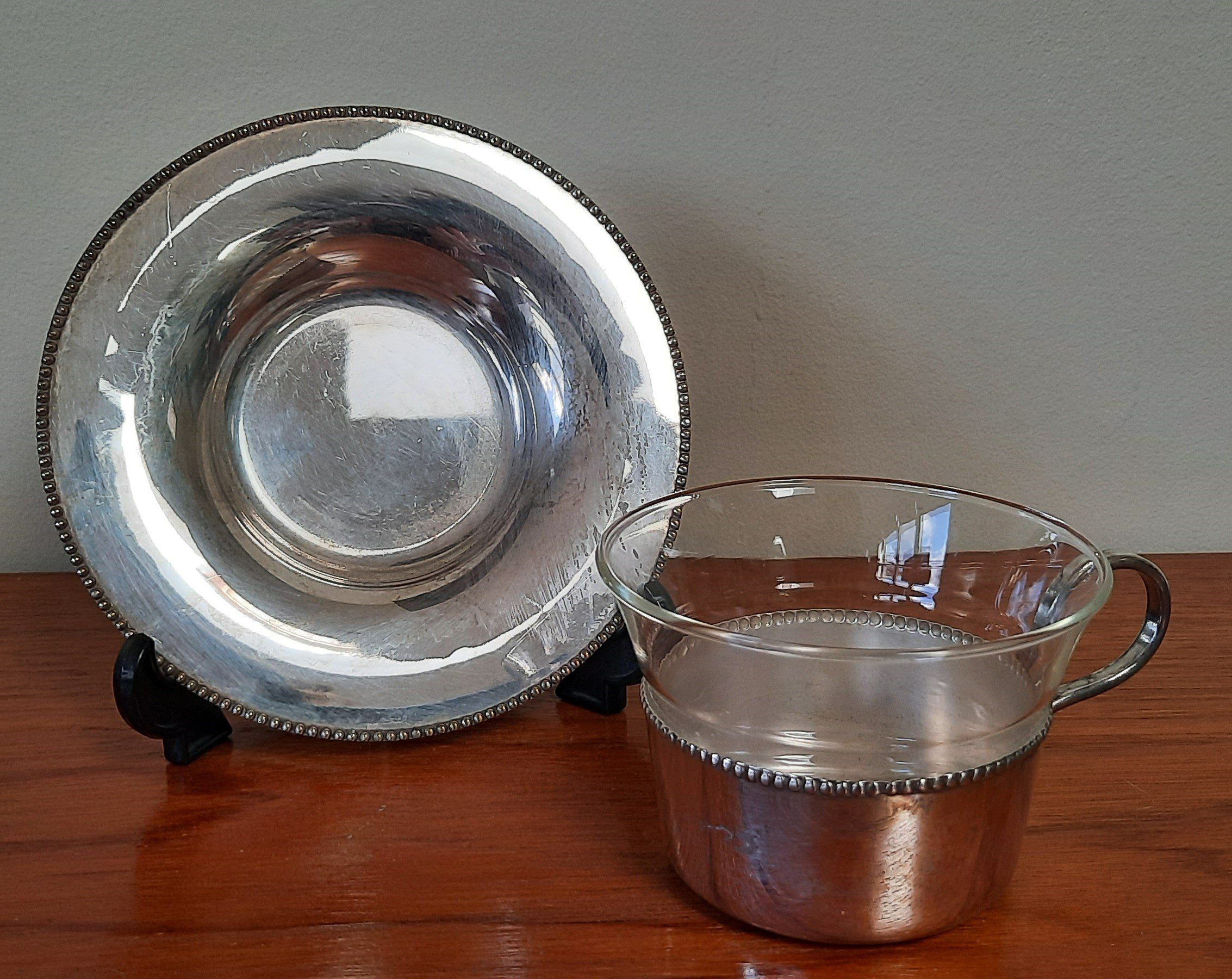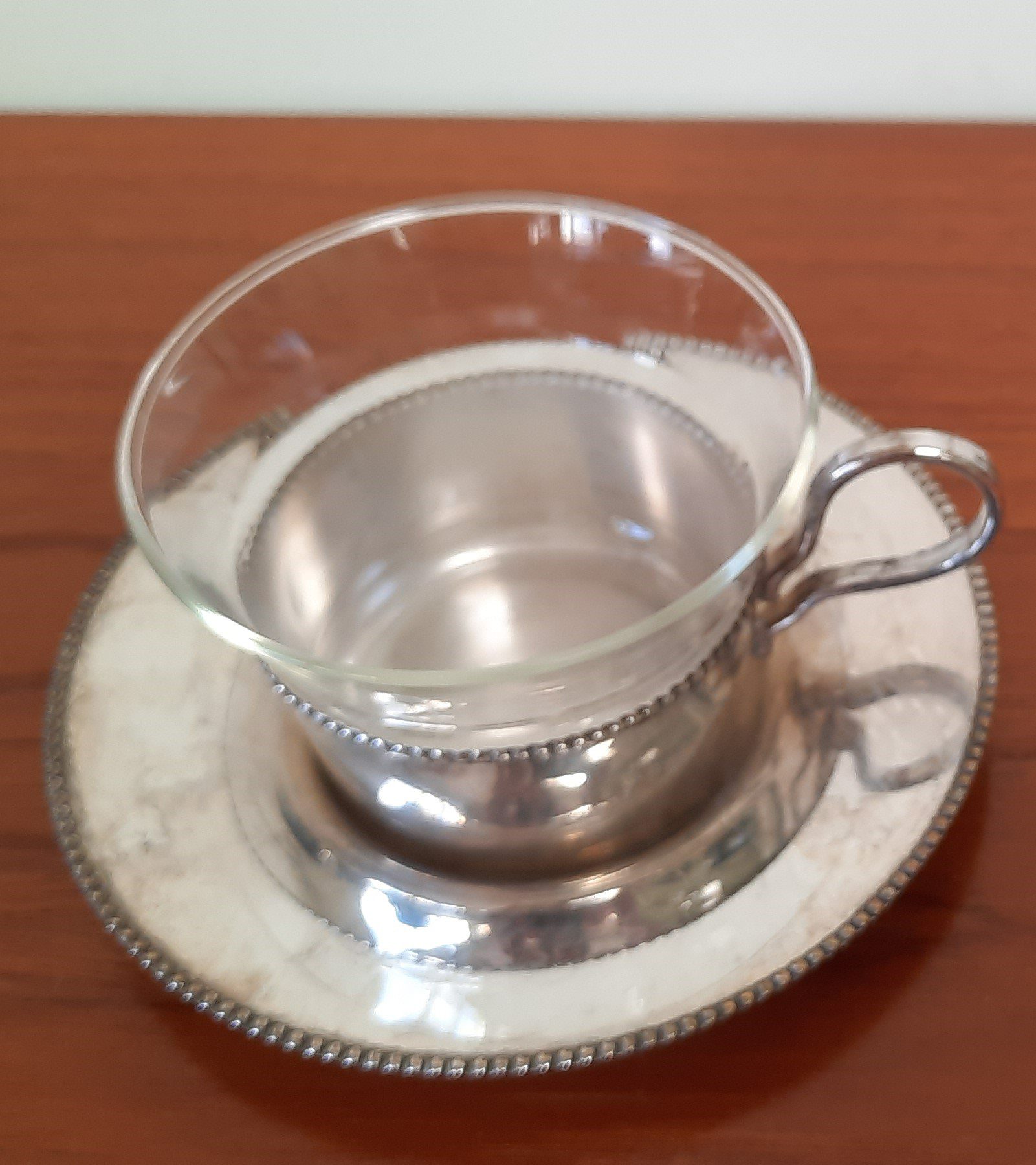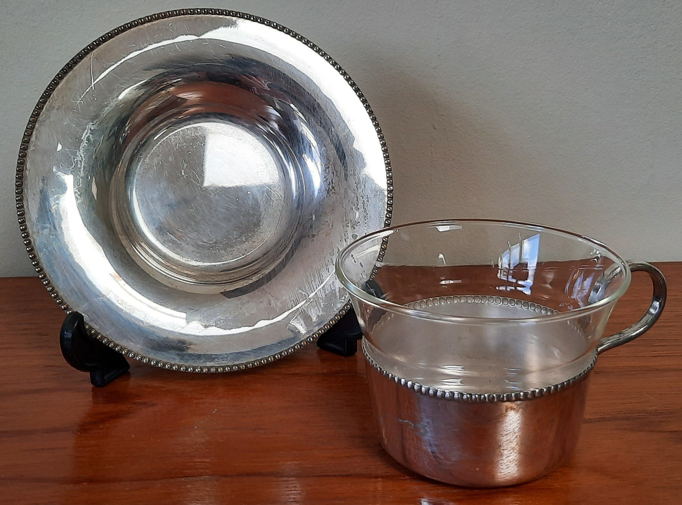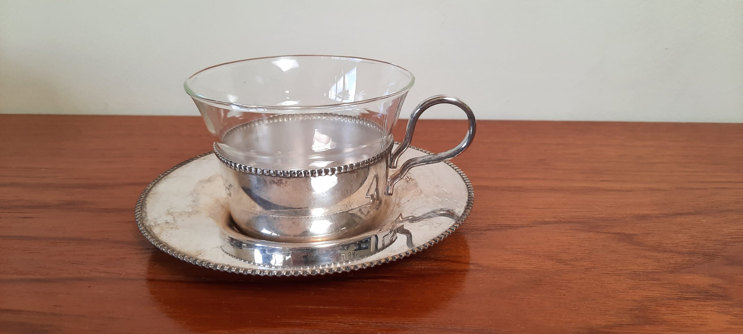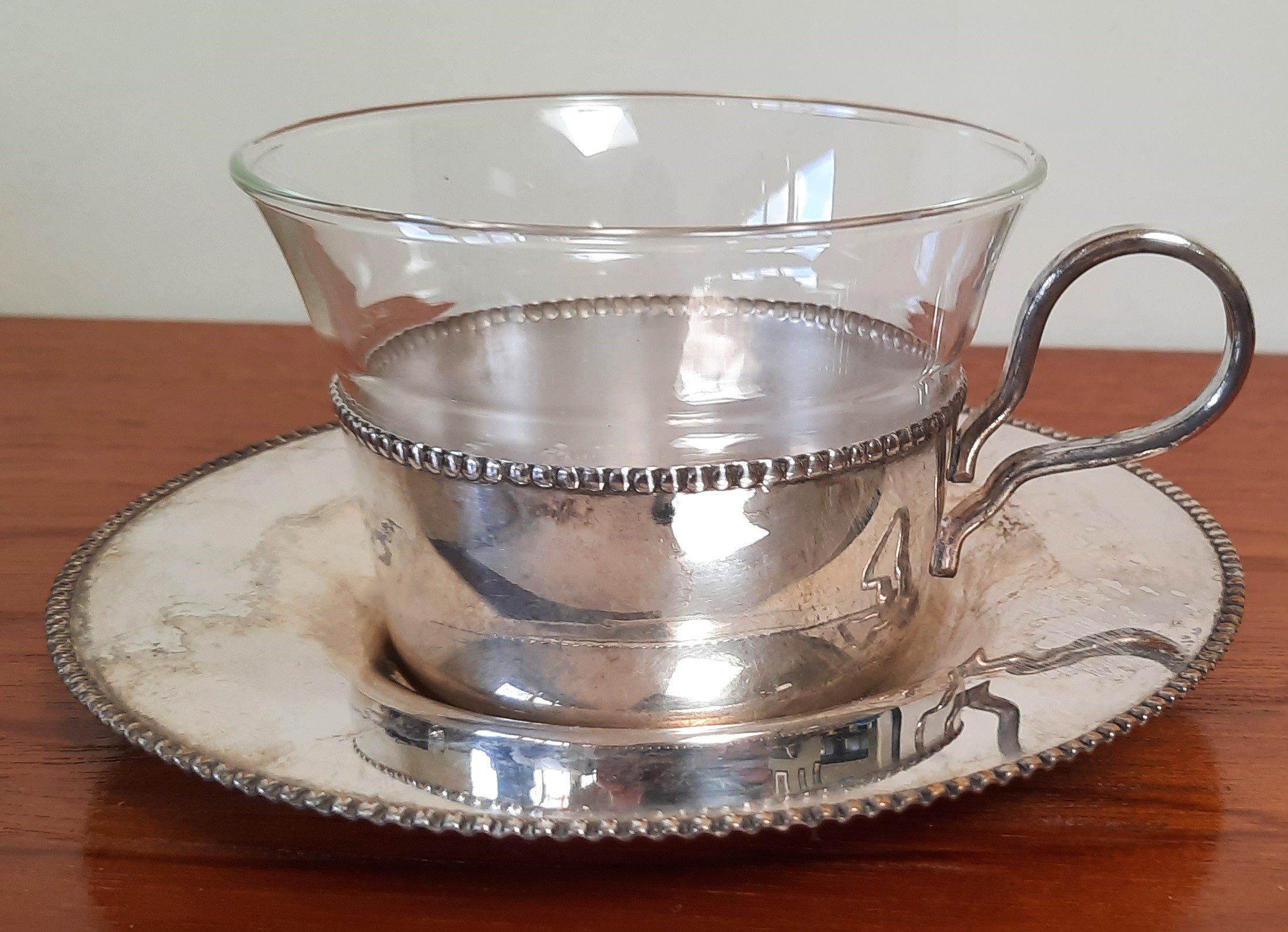 het schoteltje is van zilver, het kopje van zilver en glas.